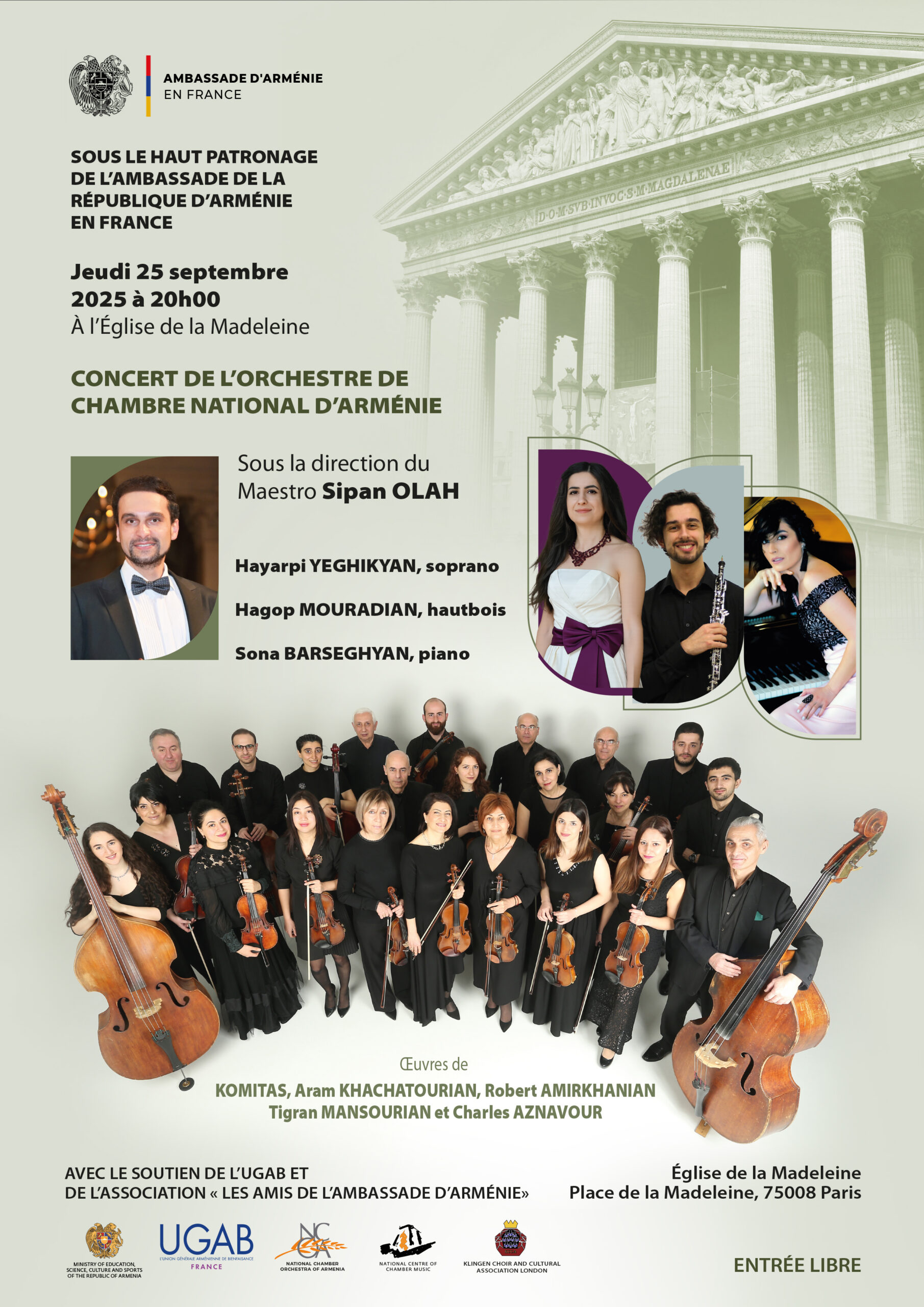 Jeudi 25 septembre 2025 à 20h00 À l’Église de la Madeleine Sipan OLAH, chef d’orchestre, ténor, directeur artistique et de concert Hayarpi YEGHIKYAN, soprano Hagop MOURADIAN, hautbois Sona BARSEGHYAN, piano