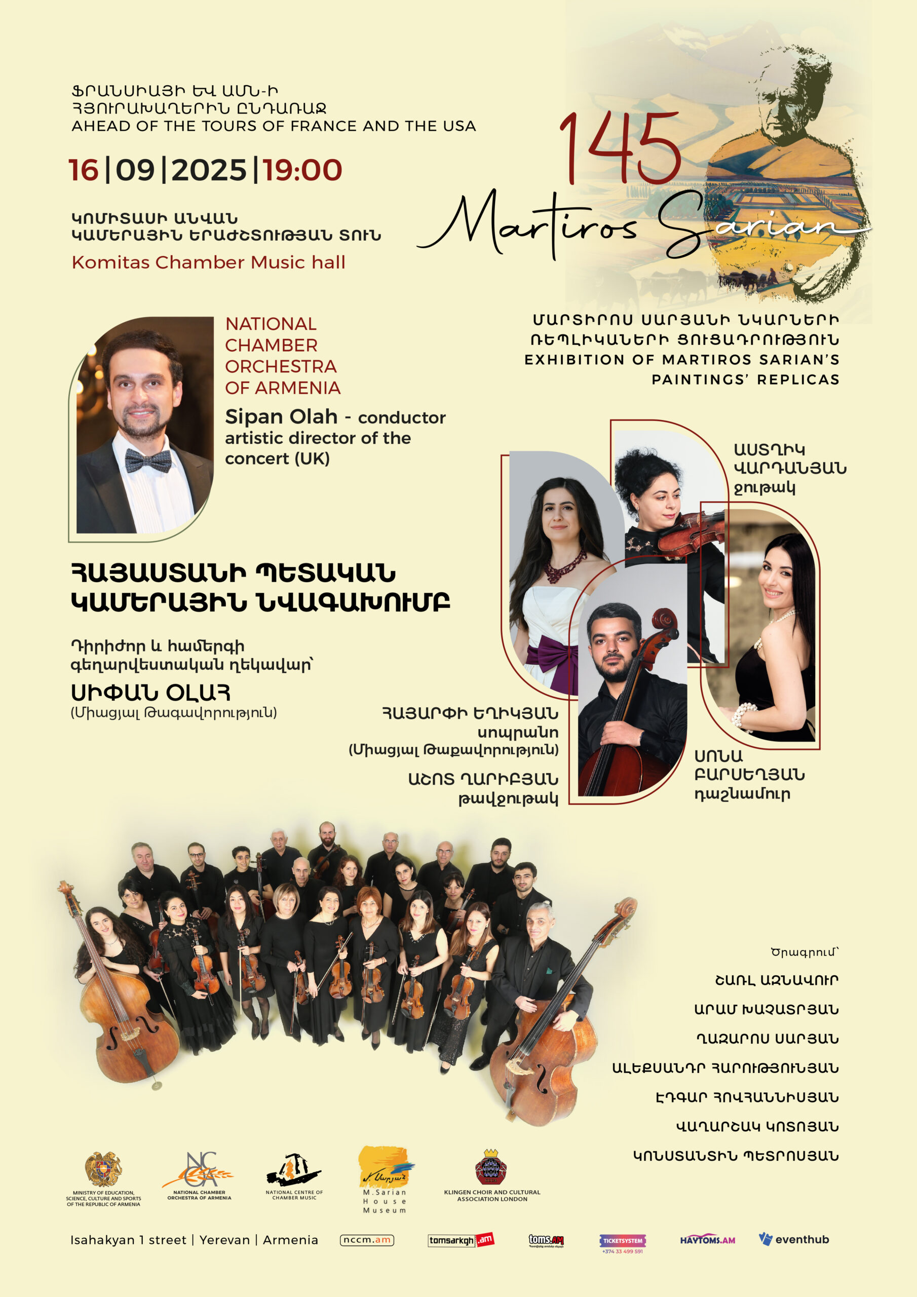 A musical event in cooperation with British Armenian maestro Sipan Olah. The concert is dedicated to prominent Armenian composers Alexander Spendiaryan and Lazar Sarian.