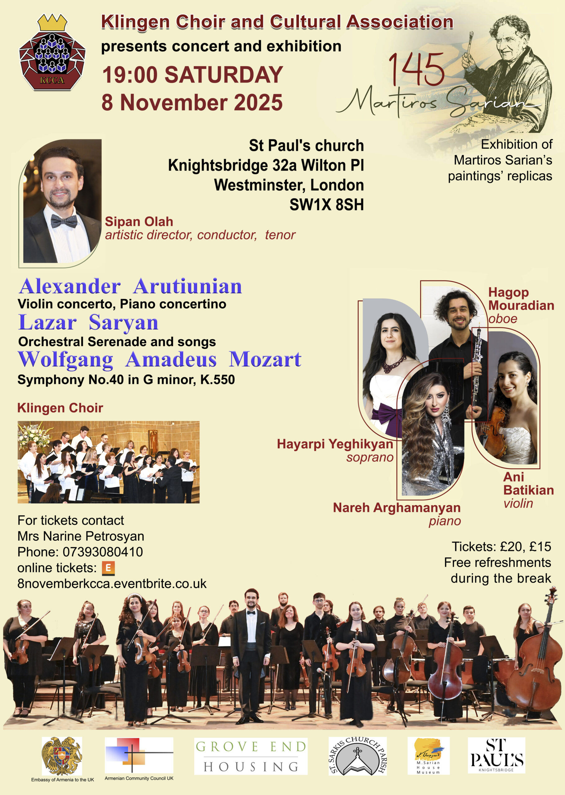 A concert and exhibition “Arutiunian, Saryan, Mozart” which will take place in London’s beautiful St Paul’s church Knightsbridge 32a Wilton Place, Westminster, London SW1X 8SH at 7pm on Saturday 8th of November 2025. Tickets: £20, £15 For tickets contact Mrs Narine Sarkisian Email: klingenchoir@gmail.com Phone: 07393080410 Online tickets: 8novemberkcca.eventbrite.co.uk